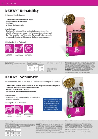 • DERBY ® Rehability kann auch eingeweicht gefüttert werden. zu ausreichend Heu oder Grassilage) Rohfaser 11,6 %, Rohasche 6,2 %, Calcium 1,1 %, 205 mg, Biotin (3a880) 200 mcg, Vitamin B1 (3a821) 10 mg, Vitamin B2 (als Riboflavin) 10 mg, Vitamin • Ausreichend frisches Tränkwasser anbieten. Aufwertung Zusammensetzung: Getrocknete Luzerne